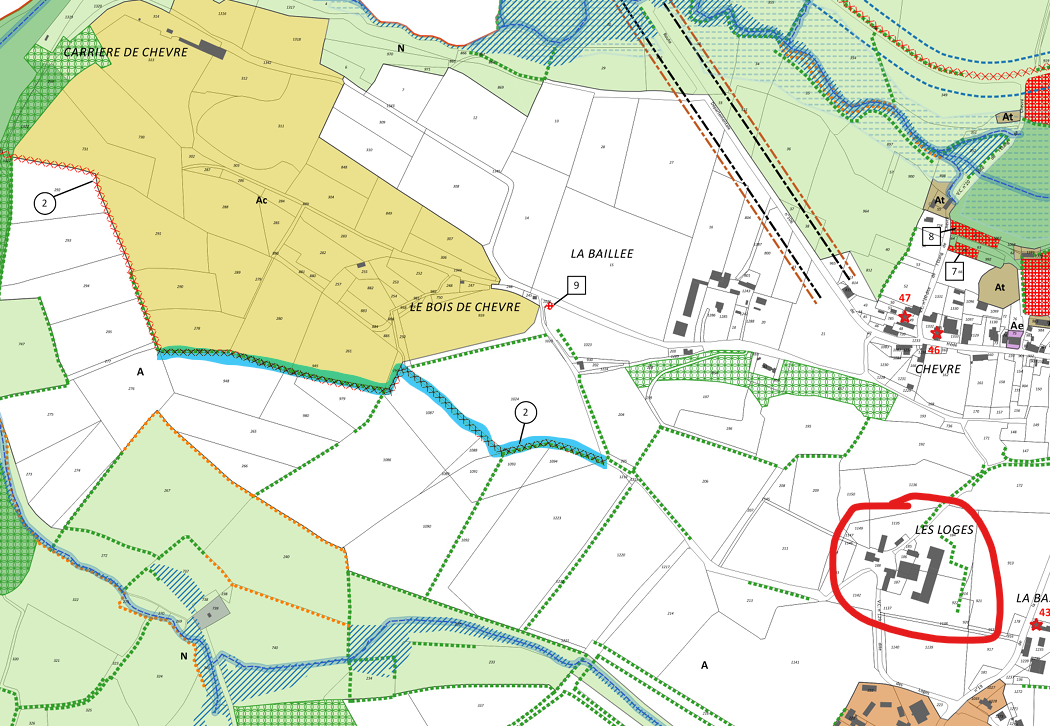 - La seconde est un extrait du PLU actuel, en bleu la réservation qui me concerne, dans le cercle rouge, le site de mon exploitation.