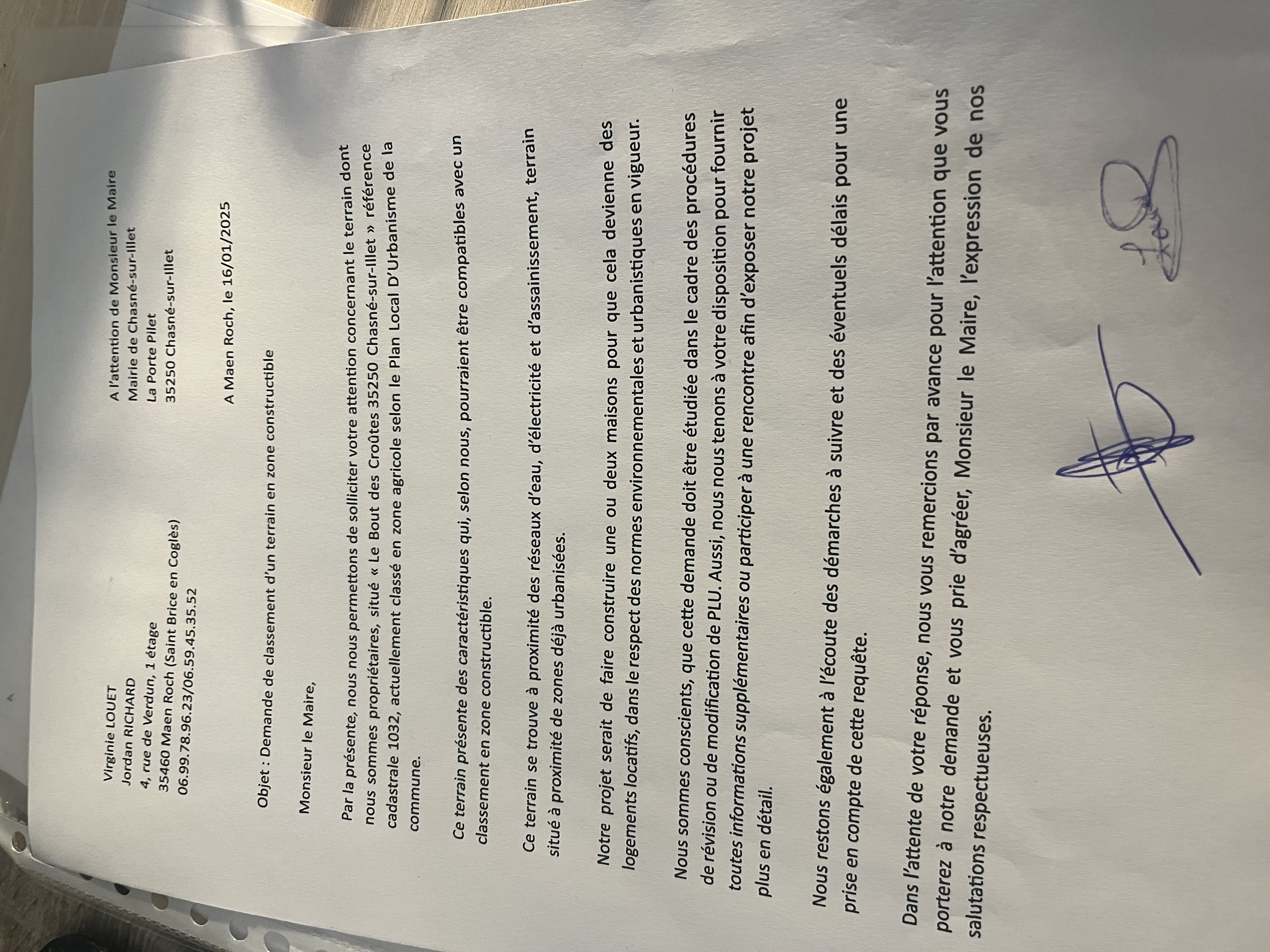 Ci-joint m’a demande de classement d’un terrain en zone constructible.