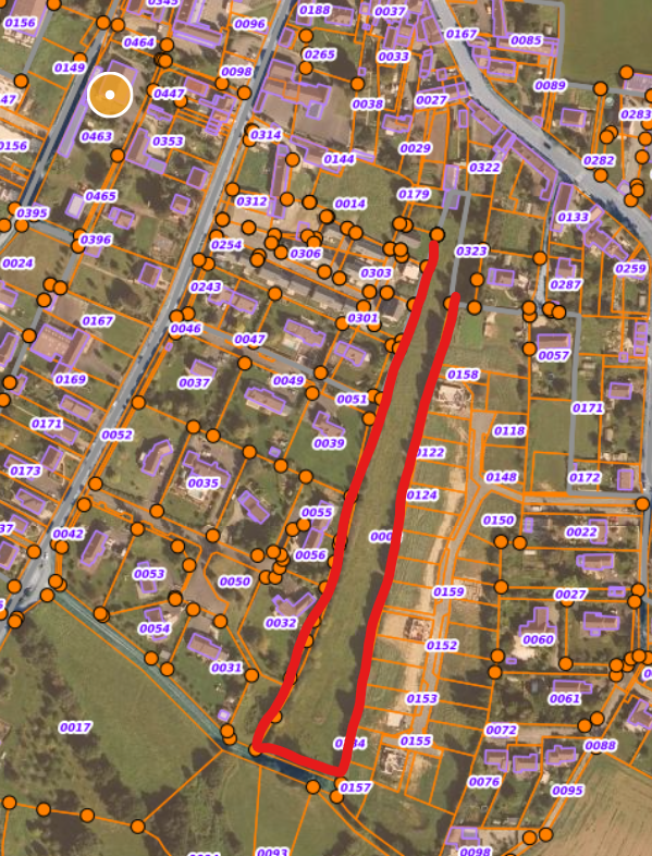- La première comporte en rouge le tracé complet de mon chemin d'exploitation. Tous les champs qui le bordent sans exception sont en ma possession et constituent ce qu'on appelle le parcellaire accessible à mes animaux sans transport.