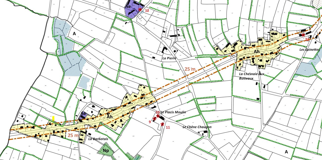 Sur cette même commune les secteurs situés au nord (La Barbotais et La Chesnaie aux Butteaux) sont aussi classés en zone Agricole, mais Ah permettant donc la constructibilité de ses terrains situés en bord de route.