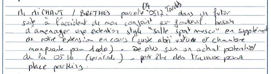 Suite à l'accident de mon conjoint en fauteuil. Besoin d'aménager une extension style "salle de muscu" en supplément de notre extension en cours (juste abri voiture et chambre manquante pour un ado). De plus sur un achat potentiel de la 516 - peut-être des travaux pour place de parking