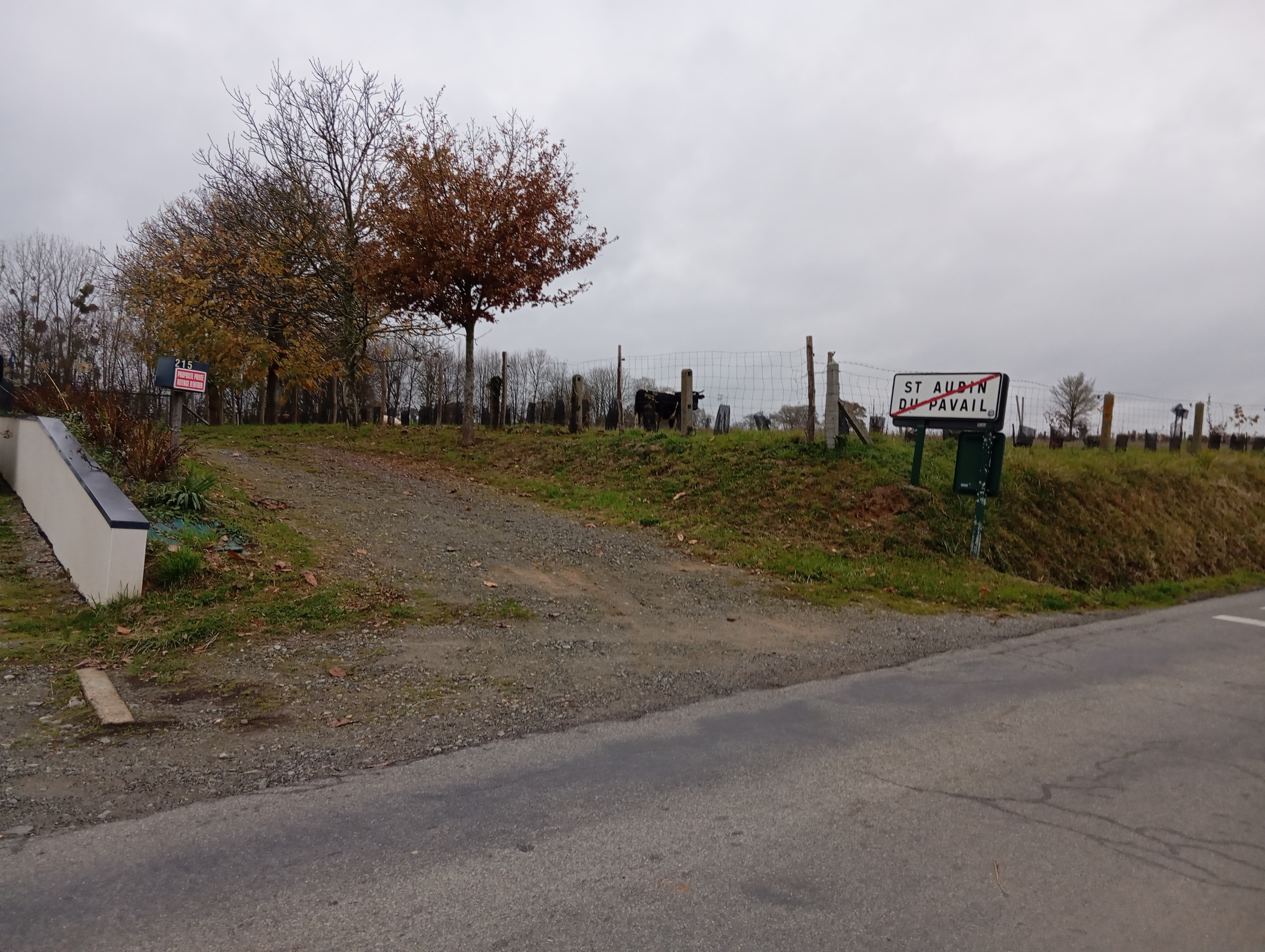 Dans le cas où il faudrait élargir ce chemin, il faudrait empiéter sur de la surface agricole, arracher des arbres plantés il y a de nombreuses années, déplanter une haie installée par Breizh bocage en 2024, acheter du terrain départemental pour créer un accès suffisant le long de la RD 463 puisqu'au delà du panneau communal la route et le talus appartiennent au département.