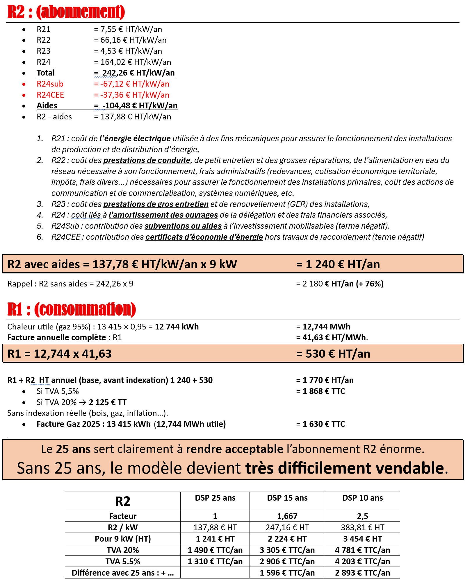 Point essentiel : dans un réseau de chaleur, la part R2 (abonnement) est souvent très dominante.