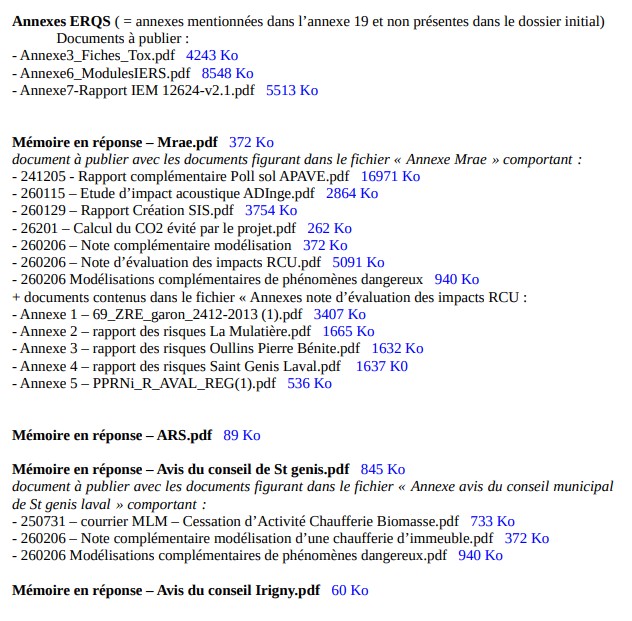 Le 30 janvier 2026 , le rapport de l'unité départementale du Rhône -DREAL "dossier complet et régulier" du 8 septembre 2025 a été porté à la connaissance du public par trois habitants du sud-ouest-lyonnais qui ont consulté le dossier papier à la préfecture et sollicité ce document. Communiqué à la commissaire enquêteur pour information à l'automne 2025 , il n'avait pas été autorisé à la diffusion. Il comprend : l'analyse de la complétude (étude d’impact R 122 .5 code de l'environnement) et de régularité de la demande( R 181.13 ) sur l’objet : " Dossier de Demande d’Autorisation Environnementale pour une installation de combustion (chaufferie gaz et biomasse). A cette date, les inspecteurs ont proposé de lancer la procédure de consultation du public " parallélisée" de l'article L 181.10.1 du code de l'environnement avec saisine des services contributeurs de l’Etat et des collectivités concernées au titre de leurs compétences : en ENVIRONNEMENT, SANTE, INCENDIE, TRANSPORTS, POLICE DE L'EAU AMENAGEMENT DU TERRITOIRE