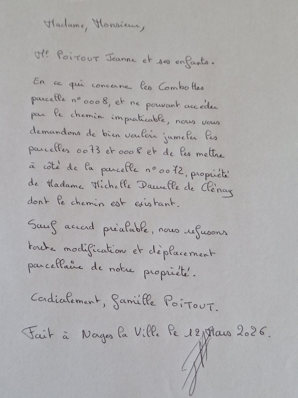 Par conséquent, sauf accords préalables nous refusons toutes modifications et déplacements parcellaires dont nous sommes propriétaires.