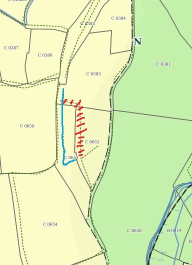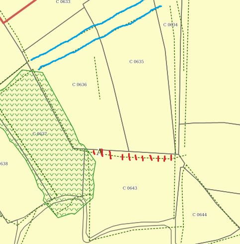 Enfin, dernière correction, plus anecdotique: le Nord de la A0991, reprise en A/A1 est recouverte par le maillage EBC, sauf qu'il ne s'y est jamais trouvé aucun arbre, sauf quelques fruitiers, depuis très longtemps. La confusion vient peut-être du fait que les cyprès de Lambert plantés sur son talus Nord étaient très développés et leur canopée paraît la couvrir en partie sur les anciennes photos aériennes.