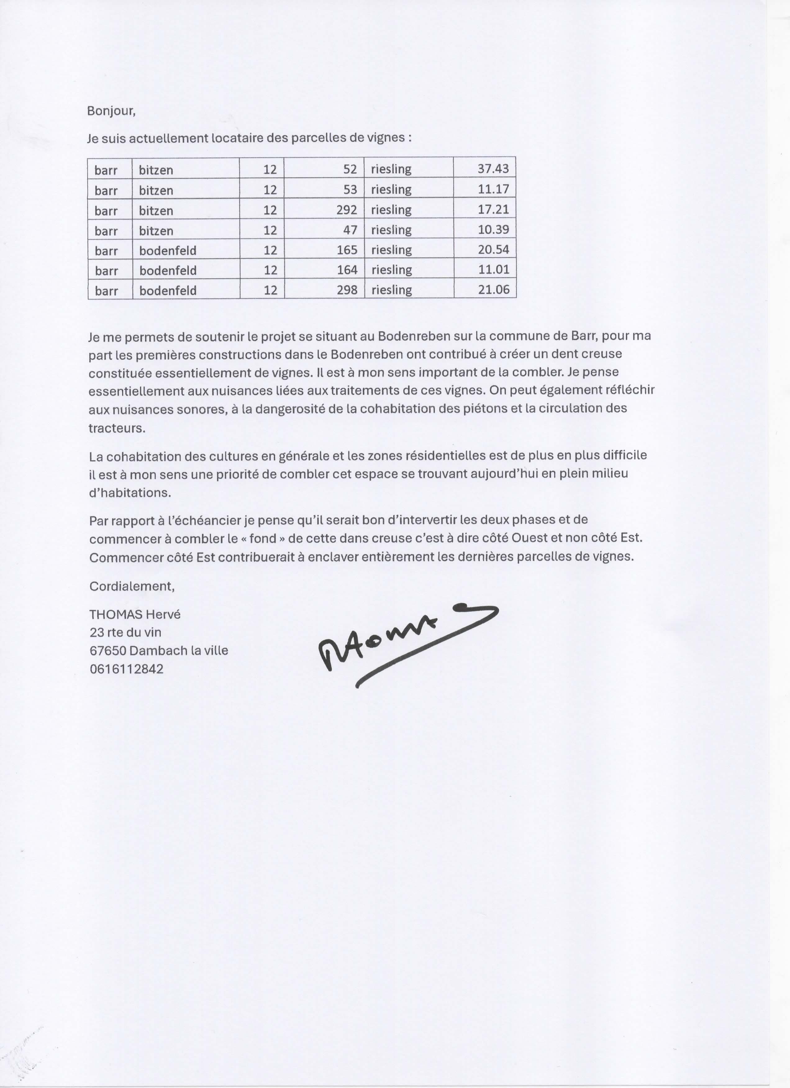 En tant que locataire et exploitant des parcelles de Mr Kamm/Wach sur le secteur de Barr Bodenfeld,nous souhaitons soumettre à votre analyse des observations cruciales concernant le projet de modification du PLUi. Nos remarques s’appuient sur la réalité de notre outil de travail et sont confortées par les avis officiels de la CDPENAF et de la Chambre d’Agriculture (pièces jointes).