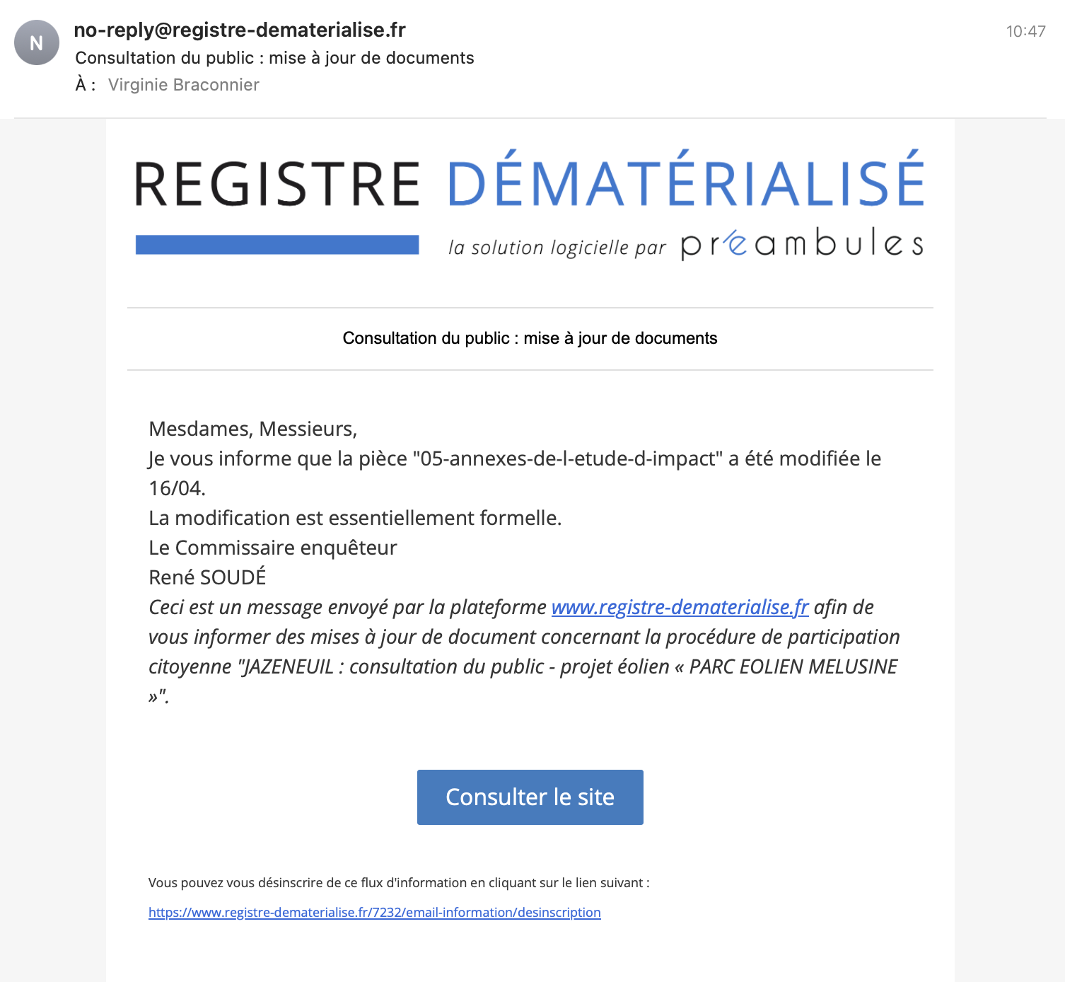 Il est indiqué, par message e-mail en date du 16 avril, que la pièce « 05-annexes-de-l’étude-d’impact » a été modifiée, la modification étant présentée comme « essentiellement formelle ».