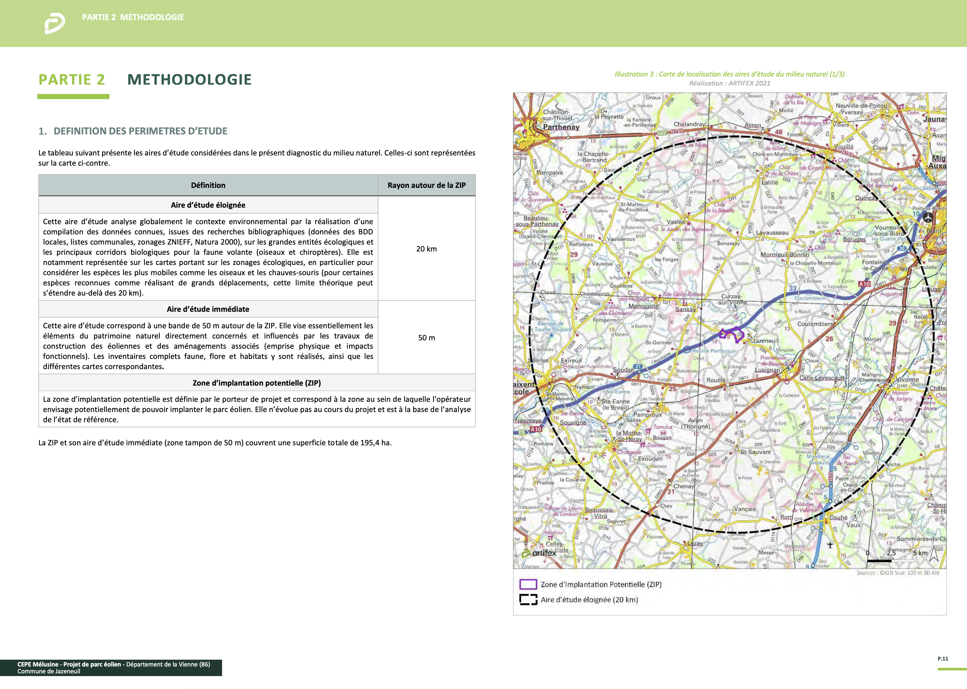 « Volet Naturel de l’Étude d’Impact – 01/2026 – Réalisation de l’étude ARTIFLEX – Maître d’ouvrage CEPE Mélusine – Partie 2 Méthodologie – 1. Définition des périmètres d’étude – page 11 ».