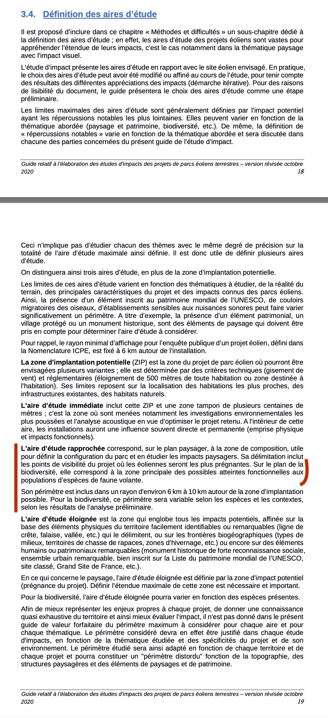 (Guide relatif à l'élaboration des études d’impacts des projets de parcs éoliens terrestres - version révisée octobre 2020 : https://www.ecologie.gouv.fr/sites/default/files/documents/Guide_EIE_MAJ%20Paysage_20201029-2.pdf)